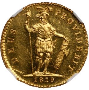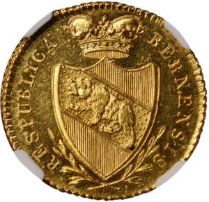 This specimen was lot 40392 in Ponterio sale 168 (Philadelphia, August 2012), where it sold for $1,610. The catalog description[1] noted, "SWITZERLAND. Bern. Duplon, 1819. NGC Unc Details--Scratches. Small scratch on obverse field. Demarete Collection." This type was issued 1797, 1819 and 1829 and is rare. The last Bernese coin is a rappen dated 1836.