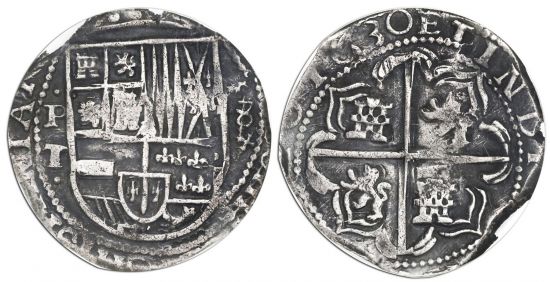 The first specimen was lot 476 in Sedwick Treasure Auction 26 (Winter Park, FL, November 2019), where it sold for $833. The catalog description[1] noted, "Potosí, Bolivia, cob 8 reales, 1630T, cross-fleury ornaments flanking denomination, PCGS XF40. Choice bold details all over with lovely rich toning, bold full 30 of date, full dot-P-T-dot and denomination x-8-x (the x's actually small crosses-fleury), a lovely specimen to be sure." This type, the archetypal "piece of eight" of pirate lore, was struck 1622-48, throughout the first part of the reign of Philip IV. Dates were added in 1617; even so, many are so crudely made that the dates are not legible. It is the most common Latin America silver coin of the seventeenth century and the only one that can be collected by date. At some point, local officials began illegally debasing these coins, down to .700 fine in some cases. When this was discovered in 1648, a major scandal erupted and one mintmaster paid with his life. All the suspect silver was recalled for melting and reissue in the new design of 1652 (KM 21), with the result that cobs dated 1636-48 are today very rare. The second specimen was lot 6282 in CNG Triton XXVIII (New York, January 2025), where it sold for $796.25. The catalog description[2] noted, "BOLIVIA, Colonial (as Alto Perú). Felipe IV. King of Spain, 1621-1665. AR 8 Reales. Cob type. Potosí mint. Struck 1630s. Crowned coat-of-arms; P/ T to left / Arms of Spain within angled quadrilobe. Menzel Po-201; KM 19a. Toned. Good VF."