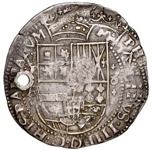 This type was struck 1625-48 at Potosi. While silver cobs from Bolivia are very common, this early type is rare, as most were recalled and melted when it was discovered that the mint operators had been systematically debasing their issues, sometimes as low as .700 fine. Round "royals" such as this, which were never intended to circulate, probably had a better chance of escaping melting. Assayer "R" is also noted for this date.