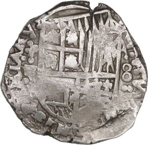 This specimen was lot 550 in Sedwick Auction 36 (Winter Park, FL, November 2024), where it sold for $1,320. The catalog description[1] noted, "BOLIVIA, Potosí, cob 8 reales, 1646 V/TR, rare, ex-Ponte. Full and bold ANO 1(6)46 with date in small digits as usual outside of full cross (with "furry" lions), the shield also full with bold denomination to right and fairly clear mintmark-assayer to left (could possibly be TR/V instead, unlisted either way), nice Fine with a few flat spots, hairline edge-crack. Pedigreed to the Luis R. Ponte Collection." This type was struck 1625-48 at Potosi. While silver cobs from Bolivia are very common, this early type is rare, as most were recalled and melted when it was discovered that the mint operators had been systematically debasing their issues, sometimes as low as .700 fine. Assayer V is known for 1646 only.