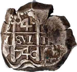 This specimen was lot 71218 in Stack's Bowers Collectors Choice sale (Costa Mesa, CA, November 2022), where it sold for $312. The catalog description[1] noted, "BOLIVIA. Cob 4 Reales, 1740-P. Potosi Mint; Assayer Diego de Pui (P). Philip V. PCGS Genuine--Environmental Damage, EF Details. The noted environmental damage on this Cob refers to the verdigris corrosion on the reverse. This damage does not, however, diminish this coin's enticingly well-preserved detail which includes a prominent date on the obverse and assayer and mintmark on the reverse. From the Pat Johnson Collection. Ex: Paul Karon Collection (Ponterio 3/90) Lot # 426." This type was struck for Philip V through his entire reign. Assayer "M" stamped coins 1737-40 along with assayer "P" for 1740-43. The silver cobs were debased from 0.931 fine to 0.917 fine in 1728. The two assayers are priced the same for 1740.