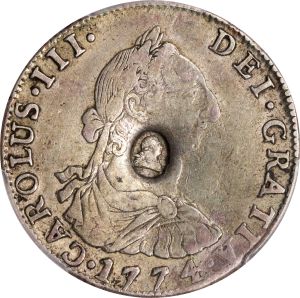 The first specimen was lot 71267 in Stack's Bowers Collectors Choice sale (Costa Mesa, CA, November 2022), where it sold for $144. The catalog description[1] noted, "BOLIVIA. 4 Reales, 1774-PTS JR. Potosi Mint. Charles III. PCGS Genuine--Cleaned, AU Details. Variety without crosslet 4. Shallow surface abrasions on the obverse attest to the cleaning applied to this 4 Reales piece. That aside, the coin displays outstanding detail and luster. The surfaces show a striking marbled tone with mauve and pale yellow hues. A beautiful coin in spite of its flaws. From the Pat Johnson Collection. Privately purchased from Harvey Bruns, circa 1968." The second specimen was lot 71512 in Stack's Bowers Collectors Choice sale (Costa Mesa, CA, November 2022), where it sold for $900. The catalog description[1] noted,
