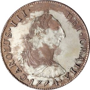 This is an early example of a type struck 1773-89 at Potosi, Bolivia (then called Upper Peru). It was replaced in 1791 by the bust of Charles IV. Harris[2] notes that Potosi four reales of Charles III are the commonest mint, with twice as many as Mexico City. Recent hoard finds have only increased this number.