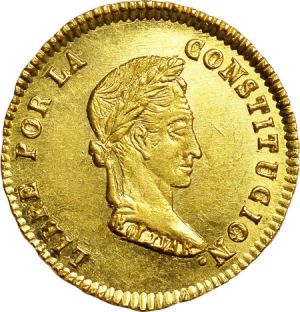 This specimen was lot 30017 in Heritage sale 3029 (New York, January 2014), where it sold for $2,585. The catalog description[1] noted, "The Finest Graded by NGC Republic gold Escudo 1856 PTS-FJ, MS63 NGC. The best one could imagine for the type. An absolutely full strike leaves the design boldly impressed, the fields glimmering with prooflike reflectivity, and the dentils rising boldly from the fields. Delicately preserved surfaces with no mentionable marks confirm premium quality and, for the specialist, should signal an opportunity. The single finest graded example of the date at NGC. Ex: 'Colonel' E.H.R. Green; Green Estate' Partnership of Eric P Newman/B.G. Johnson." While silver coins from Bolivia exist in vast quantities, gold from Bolivia is scarce. For the colonial period, Colombia may be regarded as the most prolific issuer, followed by Mexico, followed by Peru. Bolivia, Chile and Guatemala are minor sources. This type was struck 1852-56 and is seldom seen, despite the modest catalog value.