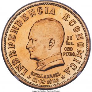 This specimen was lot 30139 in Heritage auction 3096 (Dallas, TX, March 2021), where it sold for $2,400. The catalog description[1] noted, "Bolivia. Republic gold "Revolution" 35 Gramos (50 Bolivianos) 1952-(a) MS63 NGC, Paris mint, Struck in a mintage of only 2,857 in commemoration of the 1952 Revolution, and thus the lowest mintage issue in the commemorative series, with other type mintages ranging from 7,142 to 79,000. Lustrous and choice, only a minute scratch crossing from the left obverse field into Villarroel's bust noted for accuracy. From the Paramount Collection." In 1952, a newly installed regime issued a series of four tokens in gold (3.5 g, 7 g, 14 g and 35 g gold) of which this is the largest. It was theoretically equal to fifty bolivianos.