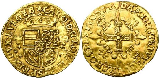 The couronne d'or was issued from Antwerp and Maastricht in Brabant 1542-55, as well as Flanders, Holland, Gelderland and elsewhere. Couronnes d'or were struck again in the Spanish Netherlands about 1615-42 but by then the northern provinces had seceded.