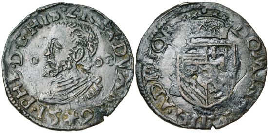 "BRABANT, Duché, Philippe II (1555-1598), restauré, Cu gigot (duit), 1593, Maastricht. D/ B. cuir. à g. Trois annelets dans le champ. R/ Ecu couronné. Petits défauts de flan. Très Beau à Superbe. (duchy of Brabant, Philip II, 1555-98, restored, copper gigot of 1593, Maastricht mint. Obverse: armored bust right, three annulets in the field; reverse: crowned arms. Minor planchet defects, Very Fine - Extremely Fine.)"