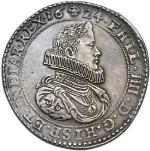 "BRABANT, Duché, Philippe IV (1621-1665), AR ducaton, 1624, Bruxelles. Premier type. Piéfort de poids double. D/ B. cuir. à d., une grande fraise au col. R/ Ecu couronné, tenu par deux lions. En dessous, le bijou de la Toison d'or. Très rare. Frappé sur un flan de double patagon. Belle patine. presque Superbe. (duchy of Brabant, Philip IV, 1621-55, silver ducaton of 1624, Brussels mint, first type, piedfort of double weight. Obverse: Armored bust right in large ruffed collar; reverse: crowned arms supported by two lions, decorated with the jewels of the Golden Fleece. Nice patina, about extremely fine.)"