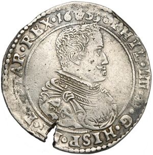 "BRABANT, Duché, Philippe IV (1621-1665), AR demi-ducaton, 1655, Anvers. Deuxième type. D/ B. dr. et cuir. à d. R/ Ecu couronné, tenu par deux lions. En dessous, le bijou de la Toison d'or. Eclat du flan. Très Beau. (duchy of Brabant, Philip IV, 1621-55, half ducaton of 1655, Antwerp mint, second type. Obverse: Draped and armored bust right; reverse: crowned arms supported by two lions, decorated with the jewels of the Golden Fleece. Flan split, very fine.)"
