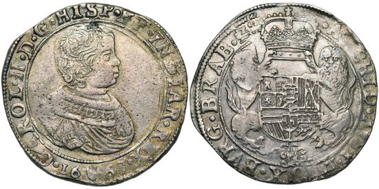 "BRABANT, Duché, Charles II (1665-1700), AR demi-ducaton, 1667, Anvers. Premier type. D/ B. enfantin à d. R/ Deux lions ten. une grande couronne au-dessus de l'écu du roi, orné du bijou de la Toison d'or. Très rare. Légère faiblesse de frappe. Très Beau. (duchy of Brabant, Charles II, 1665-1700, silver half ducaton of 1667, Antwerp mint, first type. Obverse: infant bust to right; reverse: crowned arms supported by two lions; below, the jewels of the Golden Fleece. Very rare, slightly weakly struck, very Fine.)"