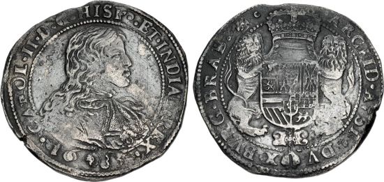 "LOW COUNTRIES, Spanish Netherlands. Karel II. 1665-1700. AR Dukaton. Bruxelles (Brussels) in Brabant mint; mm: head. Dated 1683. Cuirassed and draped bust right / Crowned coat-of-arms within leonine supporters; vuurijzer below. Toned, sea-salvaged. VF. From the Drewry Family Collection. Ex Ponterio 26 (14 December 1986), lot 1264; 1724 Slot ter Hooge Wreck.