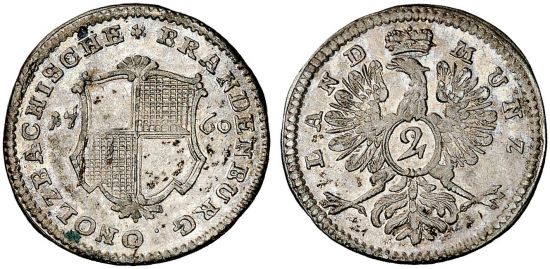 "BRANDENBURG IN FRANKEN. Christian Friedrich Karl Alexander, 1757-1791. 2 Kreuzer (1/2 Batzen) 1760, Schwabach. Slg. Grüber (Auktion Künker 267) 4632. Von großer Seltenheit. Sehr schön +. (margraviate of Brandenburg-Ansbach, Christian Frederick Charles Alexander, 1757-91, two kreuzer (half batzen) of 1760, Schwabach mint. Of great rarity, very fine or better.)"