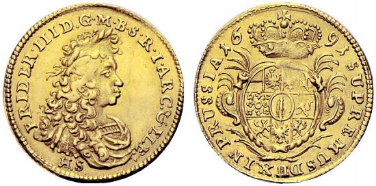 "DEUTSCHLAND Brandenburg-Preussen, 1417 Kurfürstentum, 1701 Königreich. Friedrich III. (I.), 1688-1713. Dukat 1691, Königsberg. Geharnischtes, belorbeertes Brustbild nach rechts. Rv. Wappen auf gekrönter Wappenkartusche mit Zweigen. Prägeschwäche. Sehr schön-vorzüglich. (Germany, electorate of Brandenburg, Frederick III, 1688-1713, ducat of 1691, Königsberg mint. Obverse: armored, laureate bust to right; reverse: crowned oval arms. Weakly struck, very fine to extremely fine.)"