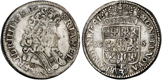 "BRANDENBURG-PREUSSEN, KURFÜRSTENTUM Friedrich III. 1688-1701. 1/3 Taler 1691, LCS, Berlin. R Randfehler, sehr schön. (Germany, electorate of Brandenburg, Frederick III, 1688-1701, one third thaler of 1691, Berlin mint. Scarce, rim nicks, very fine.)"