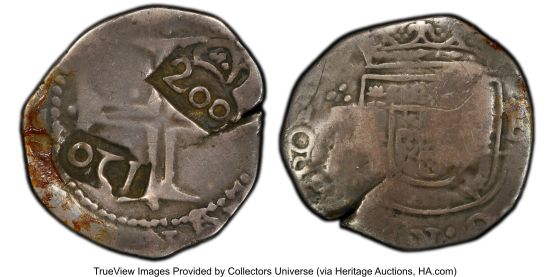 This specimen was lot 21004 in Heritage sale 61526 (Dallas, TX, July 2025), where it sold for $264. The catalog description[1] noted, "Brazil: Afonso VI Counterstamped 200 Reis (1663) VG Details (Environmental Damage) PCGS. Crowned 200 Reis (VF Details) on Portugal Tostao with Portuguese 120 Reis (1642)." The early settlers of Brazil made do with counterstamped Portuguese coins until mints were opened in the colony in the 1690's. Confusingly, another series of 200 réis counterstamps was executed in 1668 (KM 63.1).