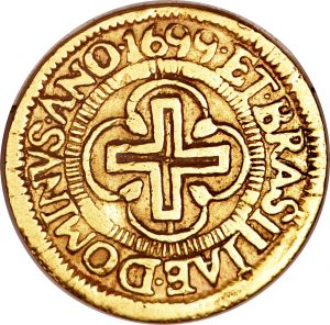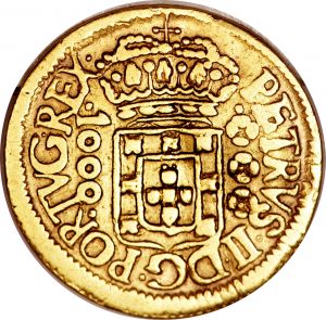 This gold 1000 réis was minted at the Rio mint in Brazil during 1699-1700, among its first issues. It was accompanied by gold 2000 and 4000 réis (KM 97 and 98). The specimen was lot 20649 in Heritage sale 3009 (Chicago, April 2010), where it sold for $690. The catalog description[1] noted, "Pedro II of Portugal gold 1000 Reis 1699, toned VF with clear details, very slight wave to the flan. Struck at Rio de Janeiro without mintmark."