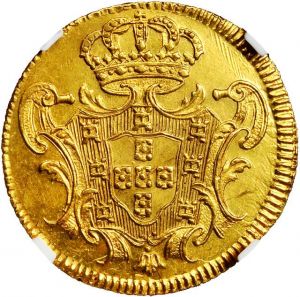This specimen was lot 487 in Ponterio sale 164 (New York, January 2012), where it sold for $4,600. The catalog description[1] noted, "BRAZIL. 6,400 Reis (Peca), 1745-R. João V (1706-50). Sharply struck and very attractive. NGC MS-62." This type was struck 1731-50 and is among the more available colonial gold coins of Brazil.