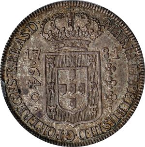 This specimen was lot 71367 in Stack's Bowers Collectors Choice sale (Costa Mesa, CA, November 2022), where it sold for $1,080. The catalog description[1] noted, "BRAZIL. 640 Reis, 1781. Lisbon Mint. Maria I and Pedro III. PCGS MS-62. By far the better of only two examples at PCGS, this Mint State example possesses tremendous eye appeal. The crisp details are complemented by fully lustrous fields. The surfaces are strikingly toned with speckled gray colors that give the piece added depth and visual interest. An exceptionally handsome example of this type. From the Pat Johnson Collection. Privately purchased from Louis Collins, 1969." This type was struck 1778-86 and this date comes in high crown and low crown varieties. The low crown is shown here.