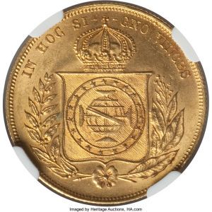 This specimen was lot 32510 in Heritage sale 3073 (Chicago, April 2019), where it sold for $552. The catalog description[1] noted, "Pedro II gold 10000 Reis 1856 MS63+ NGC, Rio de Janeiro mint. Selections from the Grand Castello Collection." This type, struck 1853-89, is among the moderately priced gold coins of the Empire of Brazil. It is part of the second reform of the coinage under the Empire; the first, in 1835, revalued the Spanish American peso from 960 réis to 1200 réis. The second reform of 1848 raised the peso to 2000 réis, where it remained until 1900.