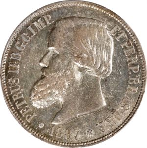 This specimen was lot 71388 in Stack's Bowers Collectors Choice sale (Costa Mesa, CA, November 2022), where it sold for $144. The catalog description[1] noted, "BRAZIL. 1000 Reis, 1887. Rio de Janeiro Mint. Pedro II. PCGS AU-58. A well-preserved piece with light argent toning and plenty of remaining luster. Scattered contact marks throughout, consistent with the grade. With a reported mintage of just 9,875, this is the scarcest date of the type. From the Pat Johnson Collection." In 1867 the silver coinage was redesigned to adopt the portrait of the emperor Pedro II, who already appeared on the gold coinage. The type went thru several minor modifications before settling on the final type shown here, struck 1876-89. Most of the fourteen dates of the type are reasonably available; this one is rather scarce.