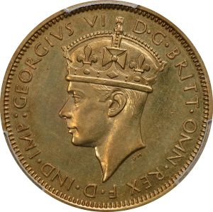 This specimen was lot 52061 in Stack's Bowers ANA sale (Pittsburgh, PA, August 2023), where it sold for $1,560. The catalog description[1] noted, "BRITISH WEST AFRICA. Shilling, 1940. London Mint. George VI. PCGS PROOF-64. An exceedingly gorgeous proof specimen, this wonderful Shilling delivers a resounding and bright brassy luster. Limitedly handled or marked, leaving this as a most impressive specimen for the dedicated enthusiast." British West Africa comprised Gambia, Sierra Leone, Gold Coast (now Ghana) and Nigeria. The union broke up in the late fifties as the parts were granted independence. This type was struck at London, Heaton and King's Norton mints 1938-47. This is a common date tho the proofs are rare. The last shilling is dated 1952.