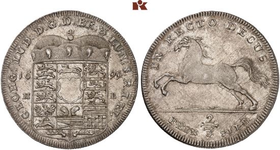 "Georg I. Ludwig, 1698-1714. 2/3 Taler 1699, Clausthal. Vorzüglich. Exemplar der Auktion Fritz Rudolf Künker 211, Osnabrück 2012, Nr. 3005. (electorate of Brunswick-Luneburg-Calenberg-Hannover, George Louis, 1698-1714, bishop of Osnabrück since 1662, two-thirds thaler of 1699, Clausthal mint. Extremely fine.)"