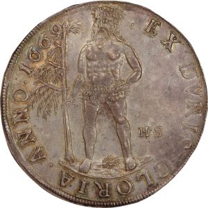 The first specimen was lot 30223 in Stack's Bowers ANA sale (Chicago, August 2022), where it sold for $2,160. The catalog description[1] noted, "GERMANY. Brunswick-Luneburg: Calenburg. Taler, 1669-HS. Zellerfeld Mint. Johann Friedrich. PCGS MS-62. Graphite gray and hints of olive blend seamlessly on this impressive, nearly-choice wildman issue, with the coin's central focus--the wildman himself--standing rather proud and majestically--quite analogous with the overall resounding quality of this very coin. From the Robert C. Knepper Collection." The second specimen was lot 30414 in Stack's Bowers ANA sale (Chicago, August 2022), where it sold for $2,280. The catalog description[1] noted, "GERMANY. Brunswick-Luneburg: Calenburg. Taler, 1669-HS. Zellerfeld Mint. Johann Friedrich. PCGS MS-61. Attractively toned with some hues of gunmetal gray and amber, this Mint State survivor offers a rather strong and bold strike, seemingly paralleling the characteristics of the Wildman himself." Christian Ludwig was duke in Calenberg 1641-48 and in Celle 1648-65. His younger brother Georg Wilhelm was duke in Calenberg 1648-65 and in Celle 1665-1705. Johann Friedrich, the third brother, was duke in Calenberg 1665-79. The last brother, Ernst August, was duke in Calenberg 1679-98 and elector of Hannover 1692-98. Ernst August's son George inherited Calenberg and Hannover in 1698, Celle in 1705 and the throne of Great Britain in 1714. This type was struck 1667-69. It varies from the earlier Dav-6544 in deleting the circle around the wild man.