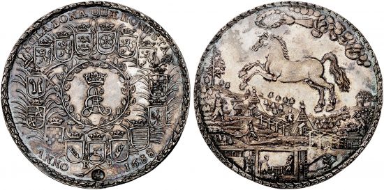 The multiple thalers of Brunswick come in many different types, all rare and expensive. By punching in the denomination after the coin was struck, the same dies could be used to make double, triple, even quadruple thalers. This issue was accompanied by a double thaler (Dav-LS244).