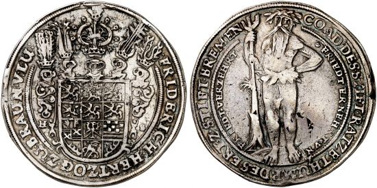 "BRAUNSCHWEIG-LÜNEBURG, HERZOGTUM Friedrich, 1636-1648. Reichstaler o. J. (1643/1645), Zellerfeld. Schrötlingsfehler, sehr schön. (Germany, duchy of Brunswick-Luneburg-Celle, Frederick, 1636-48, undated thaler, Zellerfeld mint. Rim nicks, very fine.)"
