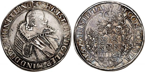 "BRAUNSCHWEIG UND LÜNEBURG, BRAUNSCHWEIG-WOLFENBÜTTEL, HERZOGTUM Christian, Bischof von Minden, 1611-1633. Reichstaler 1622, Clausthal. Sehr schön. (duchies of Brunswick-Luneburg and Brunswick Wolfenbuttel, Christian, bishop of Minden, 1611-33, thaler of 1622, Clausthal mint. Very fine.)"