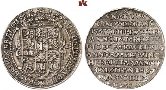"BRAUNSCHWEIG UND LÜNEBURG, BRAUNSCHWEIG-LÜNEBURG, FÜRSTENTUM, August der Ältere, 1633-1636, seit 1610 Bischof von Ratzeburg. 1/4 Reichstaler 1636, Zellerfeld, auf seinen Tod am 1. Oktober. R Sehr schön-vorzüglich. Aus der Sammlung eines Ingenieurs. Exemplar der Slg. Elbeshausen, Auktion Westfälische Auktionsgesellschaft 68, Dortmund 2014, Nr. 702. (Germany, duchy of Brunswick-Luneburg-Celle, Augustus the Elder, 1633-36, bishop of Ratzeburg since 1610, quarter thaler of 1636, Zellerfeld mint, on his death on October 1. Rare, very fine to extremely fine.)"