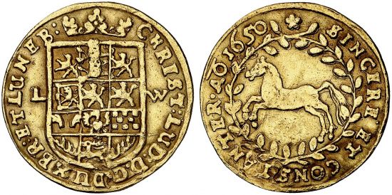 "BRAUNSCHWEIG UND LÜNEBURG, BRAUNSCHWEIG-LÜNEBURG, Christian Ludwig, 1648-1665. Dukat 1650, Clausthal. GOLD. RR Leicht bearbeitet, fast sehr schön. (Germany, duchy of Brunswick-Luneburg-Celle, Christian Louis, 1648-65, ducat of 1650, Clausthal mint. Rare, lightly tooled, about very fine.)"