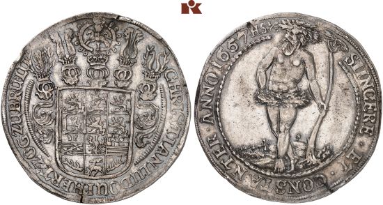 "BRAUNSCHWEIG-LÜNEBURG-CELLE, FÜRSTENTUM, Christian Ludwig, 1648-1665. Reichstaler 1657, Zellerfeld. Seltener Jahrgang. Kl. Randfehler, kl. Schrötlingsriß, fast vorzüglich. (duchy of Brunswick-Luneburg-Celle, Christian Louis, 1648-65, thaler of 1657, Zellerfeld mint. Rare date, minor edge defects, small planchet crack, about extremely fine. Davenport shows the wrong picture for the reverse.)"