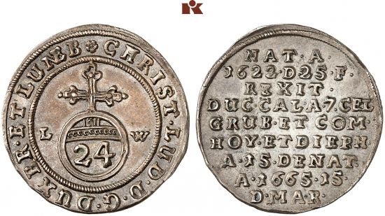 "BRAUNSCHWEIG UND LÜNEBURG, BRAUNSCHWEIG-LÜNEBURG, FÜRSTENTUM, Christian Ludwig, 1648-1665. 1/24 Taler 1665, Clausthal, auf seinen Tod am 15. März. Vorzüglich. Aus der Sammlung eines Ingenieurs. Exemplar der Slg. Elbeshausen, Auktion Westfälische Auktionsgesellschaft 68, Dortmund 2014, Nr. 748. (Germany, duchy of Brunswick-Luneburg-Celle, Christian Louis, 1648-65, 1/24 thaler of 1665, Clausthal mint, on the duke's death on March 15. Extremely fine.)"