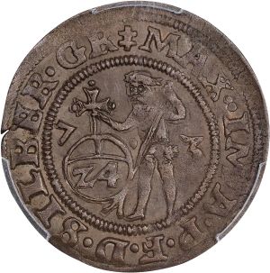 This specimen was lot 73638 in Stack's Bowers Collector's Choice sale (Costa Mesa, CA, November 2023), where it sold for $168. The catalog description[1] noted, "GERMANY. Brunswick-Luneburg: Wolfenbuttel. 1/24 Taler, "73" (1573). Goslar Mint. Julius. PCGS AU-55. An early example of the Wild Man motif, this coin exhibits good detail from a solid strike on a well-prepared flan, thus the design and legends have an alluring clarity. Steel gray surfaces are augmented by champagne across the entirety of the coin. Attractive. From the Robert C. Knepper Collection." This type was struck 1572-77 and is not expensive in worn condition. All bear two digit dates.