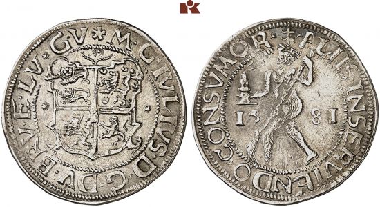 "BRAUNSCHWEIG UND LÜNEBURG, BRAUNSCHWEIG-WOLFENBÜTTEL, FÜRSTENTUMJ, Julius, 1568-1589. 1/4 Reichstaler 1581, Goslar. Lichtort. R Sehr schön +. Aus der Sammlung eines Ingenieurs. Exemplar der Auktion Fritz Rudolf Künker 20, Osnabrück 1991, Nr. 1983. (Germany, duchy of Brunswick-Wolfenbüttel, Julius, 1568-89, quarter "light" thaler of 1581, Goslar mint. Rare, very fine or better.)"