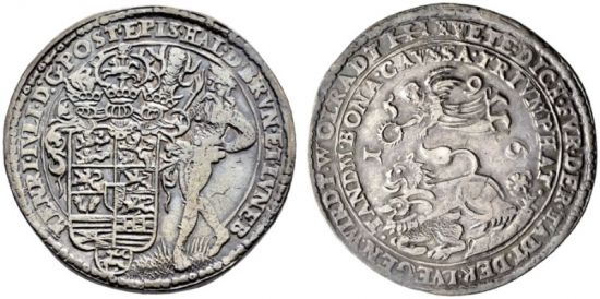 "Braunschweig-Lüneburg-Wolfenbüttel, Herzogtum, Heinrich Julius, 1589-1613 Taler 1596. Goslar Lügentaler. Sehr schön-gutes sehr schön. (Germany, Duchy of Brunswick-Wolfenbuttel, Henry Julius (1589-1613), thaler of 1596, Goslar mint, the "lying" thaler, very fine or better.)"
