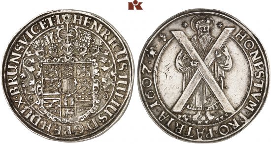 "BRAUNSCHWEIG UND LÜNEBURG, BRAUNSCHWEIG-WOLFENBÜTTEL, FÜRSTENTUM, Heinrich Julius, 1589-1613. Reichstaler 1607, Andreasberg. Ausbeute der Grube St. Andreas. Preussag Collection, Part II, Auktion London Coin Galleries/Künker 2, London 2016, Nr. 1065 var. Sehr schön. Exemplar der Auktion Fritz Rudolf Künker 75, Osnabrück 2002, Nr. 1507. (Germany, duchy of Brunswick-Wolfenbüttel, Henry Julius, 1589-1613, thaler of 1607, Andreasberg mint, for the St. Andrew mine. Very fine.)"