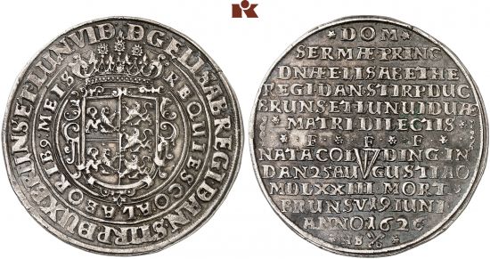 "BRAUNSCHWEIG UND LÜNEBURG, BRAUNSCHWEIG-WOLFENBÜTTEL, FÜRSTENTUM, Friedrich Ulrich, 1613-1634. Reichstaler 1626, Zellerfeld, auf den Tod seiner Mutter Elisabeth am 19. Juli; Hübsch Patina, vorzüglich. Aus der Sammlung eines Ingenieurs. Exemplar der Slg. Johann Max Böttcher, Auktion Möller 47, Kassel 2007, Nr. 231. (Germany, duchy of Brunswick-Wolfenbüttel, Frederick Ulrich, 1613-34, thaler of 1626, Zellerfeld mint, on the death of the duke's mother on July 19. Handsome patina, extremely fine.)