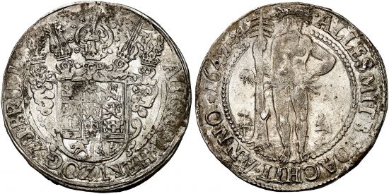 "BRAUNSCHWEIG-WOLFENBÜTTEL, HERZOGTUM August der Jüngere, 1635-1666. Reichstaler 1642, Zellerfeld. Etwas Belag, schön-sehr schön. (Germany, duchy of Brunswick-Wolfenbuttel, Augustus the Younger, 1635-66, thaler of 1642, Zellerfeld mint. Some gunk adhering, fine to very fine.)"