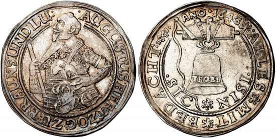 "BRAUNSCHWEIG-WOLFENBÜTTEL, HERZOGTUM August der Jüngere, 1635-1666. Reichstaler 1643, Zellerfeld. 1. Glockentaler. Hübsche Patina, fast vorzüglich. Herzog August ließ anläßlich der Befreiung der Festung Wolfenbüttel von kaiserlicher Besatzung am 13. November 1643 eine Serie von Talern prägen, auf deren Rückseite eine Glocke dargestellt ist, die die frohe Nachricht verkündet. (Germany, duchy of Brunswick-Wolfenbuttel, Augustus the Younger, 1635-66, first bell thaler of 1643, Zellerfeld mint. Handsome patina, about extremely fine. The duke struck this first bell thaler (one of nine) on the occasion of the liberation of Wolfenbuttel fortress.)"