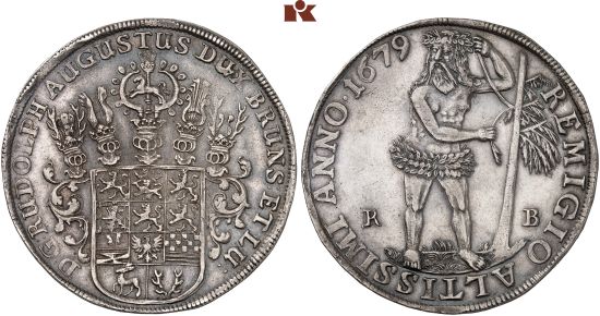 "BRAUNSCHWEIG-WOLFENBÜTTEL, FÜRSTENTUM, Rudolf August, 1666-1685. Reichstaler 1679, Zellerfeld. Attraktives Exemplar mit feiner Patina, fast vorzüglich. (duchy of Brunswick-Wolfenbuttel, Rudolf Augustus, 1666-85, thaler of 1679, Zellerfeld mint. Attractive example with fine patina, about extremely fine.)"