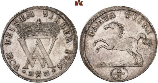 "BRAUNSCHWEIG-WOLFENBÜTTEL, FÜRSTENTUM, August Wilhelm, 1714-1731. 2/3 Taler 1716, Zellerfeld. Feine Patina, winz. Kratzer, vorzüglich. Exemplar der Auktion Gerhard Hirsch 62, München 1969, Nr. 735. (duchy of Brunswick-Wolfenbuttel, Augustus William, 1714-31, two-thirds thaler of 1716, Zellerfeld mint. Fine patina, minor scratches, extremely fine.)"