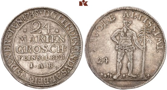 "BRAUNSCHWEIG-WOLFENBÜTTEL, FÜRSTENTUM, Ferdinand Albrecht II. 1735. 24 Mariengroschen 1735, Zellerfeld. Von großer Seltenheit. Feine Patina, sehr schön. Exemplar der Slg. Dr. Werner Koch, Auktion Dr. Busso Peus Nachf. 273, Frankfurt/Main 1970, Nr. 336, der Auktion Richard Gaettens 23, Lübeck 1973, Nr. 140 und der Auktion Tietjen + Co. 63, Hamburg 1991, Nr. 500. (duchy of Brunswick-Wolfenbuttel, Ferdinand Albrecht II, 1735, 24 mariengroschen of 1735, Zellerfeld mint. Extremely rare, fine patina, very fine.)"