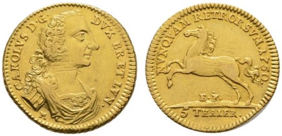 "Herzogtum Braunschweig-Wolfenbüttel, Karl I. 1735-1780 5 Taler 1750. Braunschweig. Gutes sehr schön-sehr schön. (Germany, duchy of Brunswick-Wolfenbuttel, Charles I (1735-80), five thaler of 1750, Brunswick mint. Good very fine.)"