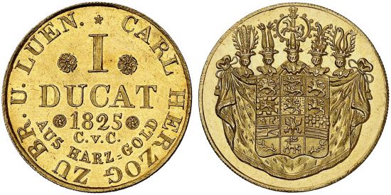 "BRAUNSCHWEIG-WOLFENBÜTTEL, FÜRSTENTUM, Karl II. 1815-1830. Selbständige Regierung, 1823-1830. Dukat 1825, CvC. Ausbeute der Harzer Gruben. Harzgold. Wert, Jahreszahl, Münzzeichen und gebogene Schrift in fünf Zeilen//Fünffach behelmtes, 12feldiges Wappen auf Wappenmantel. GOLD. Von großer Seltenheit. Nur 530 Exemplare geprägt. Prachtexemplar. Fast Stempelglanz. Exemplar der Preussag Collection, Part I. Auktion London Coin Galleries/Künker 1, London 2015, Nr. 270. (Germany, duchy of Brunswick-Wolfenbuttel, Charles II, 1815-30, sole rule, ducat of 1825, for the Harz mines. Obverse: date, value, assayer's initials and source of gold in a five line inscription; reverse: mantled, five helmeted, 12-fold arms. Very rare, only 530 pieces struck, prooflike, about uncirculated.)"