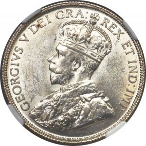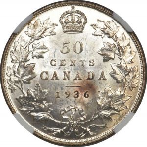 This specimen was lot 23482 in Heritage sale 3024 (Chicago, April 2013), where it sold for $940. The catalog description[1] noted, "George V 50 Cents 1936, MS63 NGC, frosty white mint brilliance, light handling in the exposed fields. Scarce in mint state." This type was struck 1920-21 and 1929-36 and superseded KM 25, struck 1912-19, which was 0.925 fine silver. Despite the low mintage, this is only a better date.