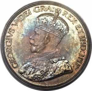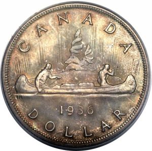 This specimen was lot 23271 in Heritage sale 3030 (New York, January 2014), where it sold for $16,450. The catalog description[1] noted, "George V Specimen Dollar 1936, Specimen 67 PCGS, aged gray and gold patina over pristine surfaces, a remarkable example of this rare Specimen Dollar. PCGS: 5 in this grade with none higher. A classic rarity in the Canadian Silver Dollar series. From The MacLeod Collection of Canada Specimen, Proof, and Prooflike Dollars." The SCWC lists this type for 1936 only but large numbers were saved, making it readily available today.