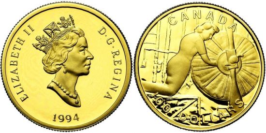 "CANADA, Elisabeth II (1952-), AV 100 dollars, 1994. Effort de guerre pendant la Seconde Guerre mondiale. Flan poli. (dominion of Canada, Elizabeth II, 1952-, gold hundred dollars of 1994, honoring the war effort during World War Two. Proof.)"