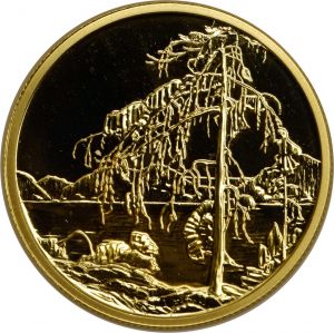This specimen was part of lot 40063 in Stack's Bowers NYINC sale (New York, January 2019), which sold for $14,400. The catalog description[1] noted, "Impressive Collection of $200 Commemorative Issues. CANADA. Assortment of $200 Commemoratives, 1990-2012. CHOICE BRILLIANT PROOF. 21 pieces in lot. First set, 1990-2001: Fr-22; Fr-24; Fr-25; Fr-28; Fr-31; Fr-33; Fr-35; Fr-37; Fr-40; Fr-43; Fr-47; Fr-52. ...Total weight 359.94 g (11.57 troy oz) of 0.917 fine gold." The profits extracted from the manufacture and sale of NCLT's caused the Royal Canadian Mint to scramble for ever more arcane topics, including this one honoring Tom Thomson's painting, The Jack Pine. Sadly, we lack the obverse image of this coin.